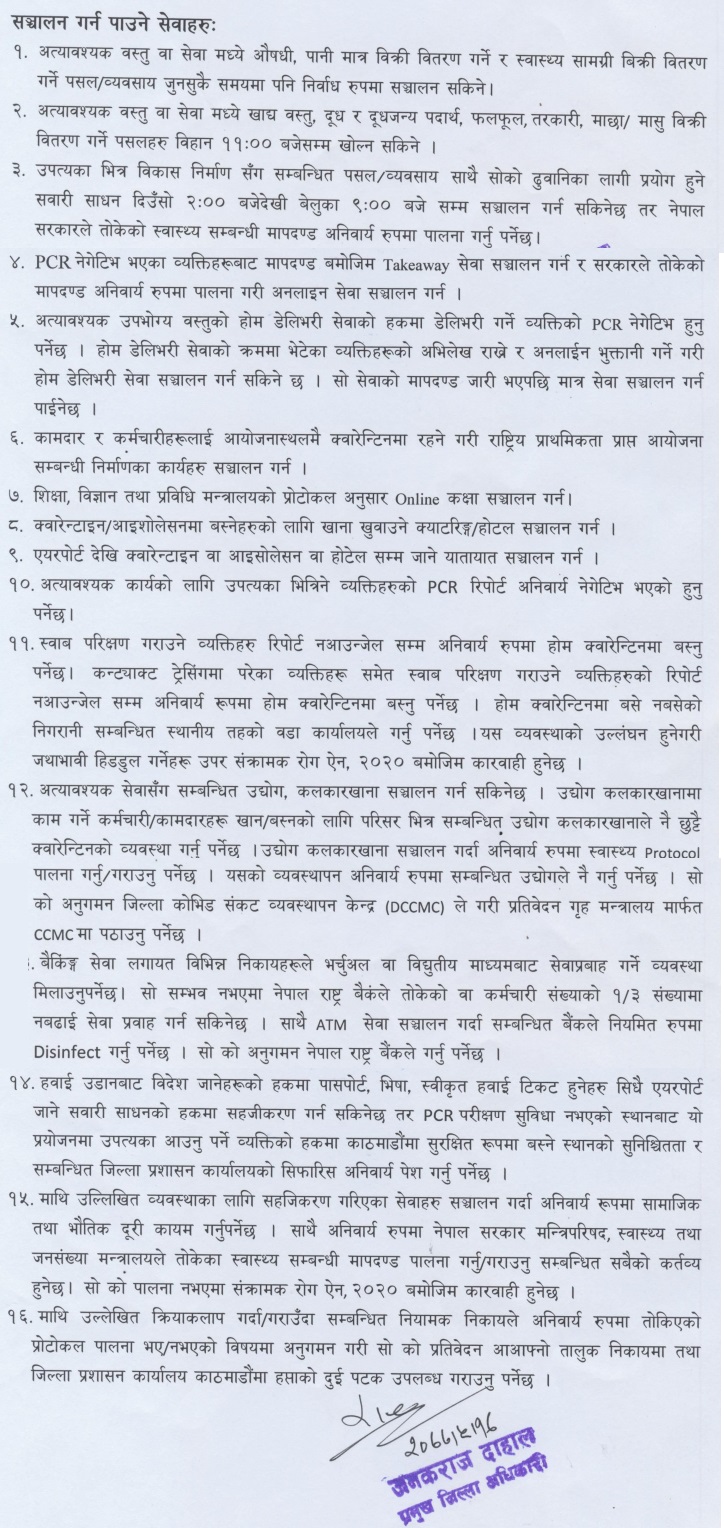 जिल्ला प्रशासन कार्यालय काठमाण्डौले जारी गरेको आदेशअनुसार भोलिदेखि संचालन गर्न पाइने सेवाहरुको सूचि यस्तो छः